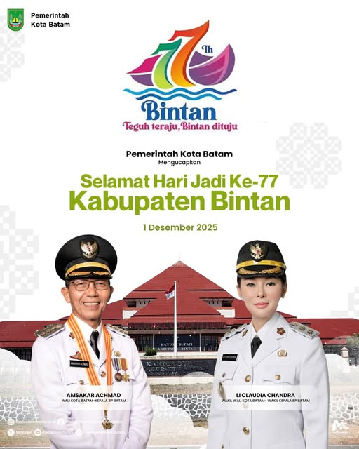 Pemerintah Kota Batam mengucapkan selamat dan sukses untuk Kabupaten Bintan yang memasuki usia ke-77 tahun. Semoga Bintan terus maju, semakin berdaya saing, dan memberi kesejahteraan bagi seluruh masyarakatnya.