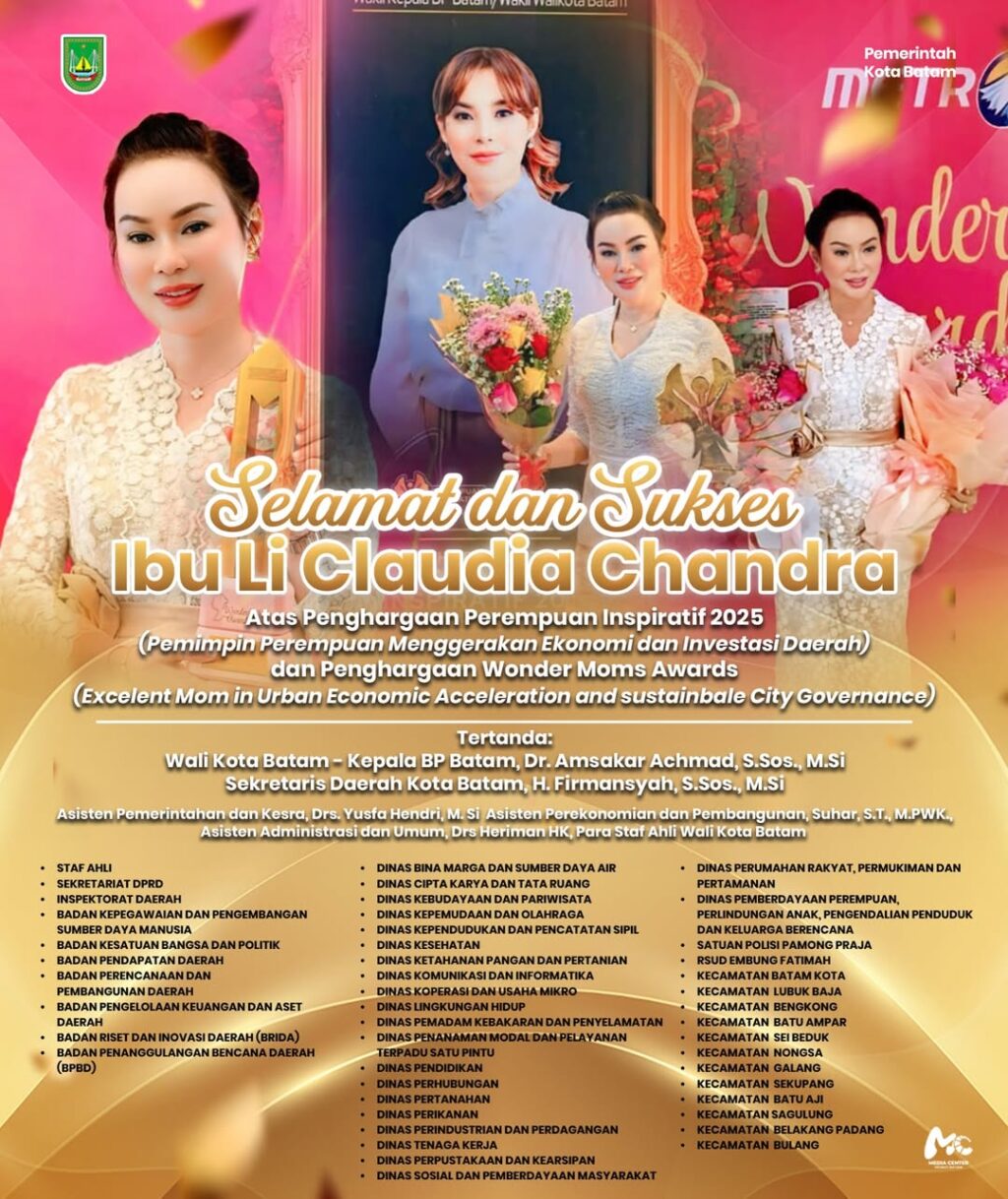 Pemerintah Kota Batam mengucapkan selamat kepada Wakil Wali Kota sekaligus Wakil Kepala Badan Pengusahaan Batam, Li Claudia Chandra, atas diraihnya Penghargaan Perempuan Inspiratif 2025 (Pemimpin Perempuan Menggerakkan Ekonomi dan Investasi Daerah) serta Wonder Moms Awards (Excellent Mom in Urban Economic Acceleration and Sustainable City Governance).